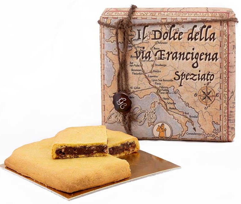Dolce con un ripieno di frutta secca, miele, pane raffermo, insaporito dal cioccolato e da spezie caratteristiche che si ritrovano sulla via francigena e rivestito da uno strato sottile di pasta frolla.